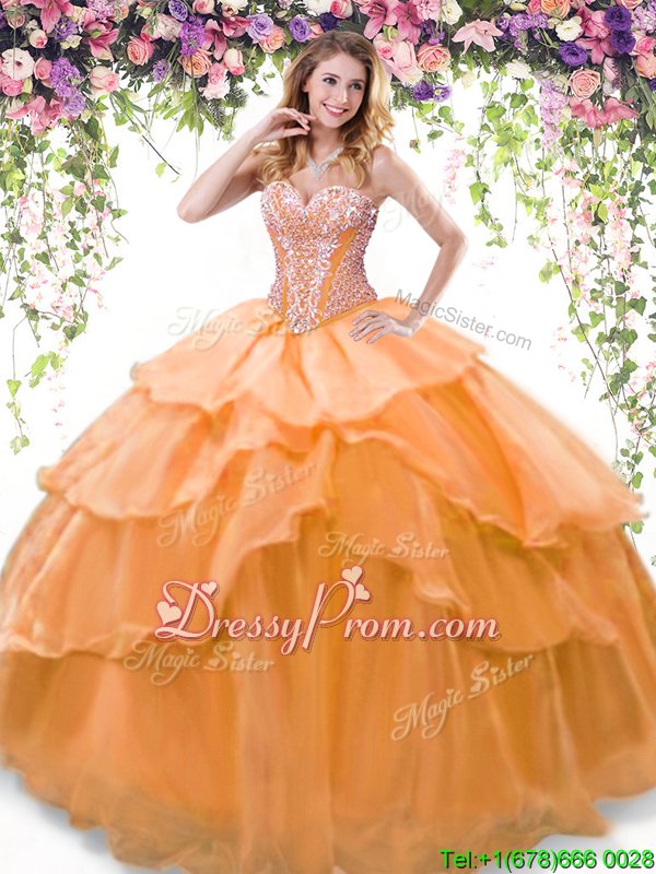 Neckline : SweetheartShown Color : OrangeSilhouette : Ball GownsSleeve Length : sleevelessHemline : floor lengthBack Detail : Lace upFabric : OrganzaEmbellishment : Beading,Ruffled LayersOccasion : Military Ball,Sweet 16,QuinceaneraSeason : Spring,Summer,Fall,Winter