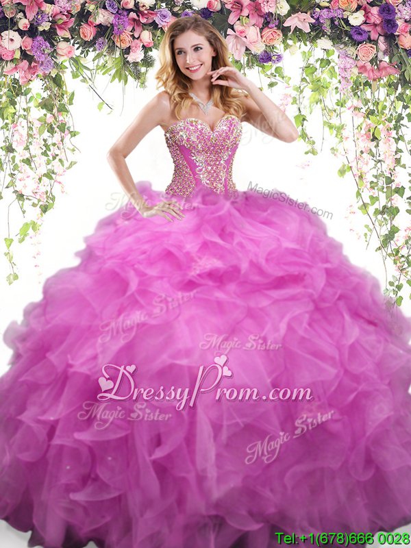Neckline : SweetheartShown Color : LilacSilhouette : Ball GownsSleeve Length : sleevelessHemline : floor lengthBack Detail : Lace upFabric : OrganzaEmbellishment : Beading,RufflesOccasion : Military Ball,Sweet 16,QuinceaneraSeason : Spring,Summer,Fall,Winter