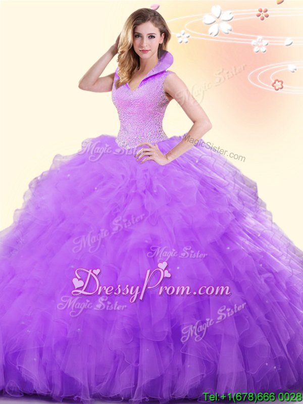 Neckline : High-neckShown Color : LilacSilhouette : Ball GownsSleeve Length : sleevelessHemline : floor lengthBack Detail : BacklessFabric : TulleEmbellishment : Beading,RufflesOccasion : Military Ball,Sweet 16,QuinceaneraSeason : Spring,Summer,Fall,Winter