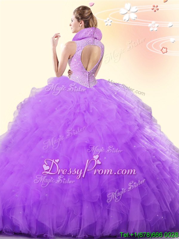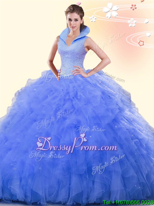Neckline : High-neckShown Color : BlueSilhouette : Ball GownsSleeve Length : sleevelessHemline : floor lengthBack Detail : BacklessFabric : TulleEmbellishment : Beading,RufflesOccasion : Military Ball,Sweet 16,QuinceaneraSeason : Spring,Summer,Fall,Winter