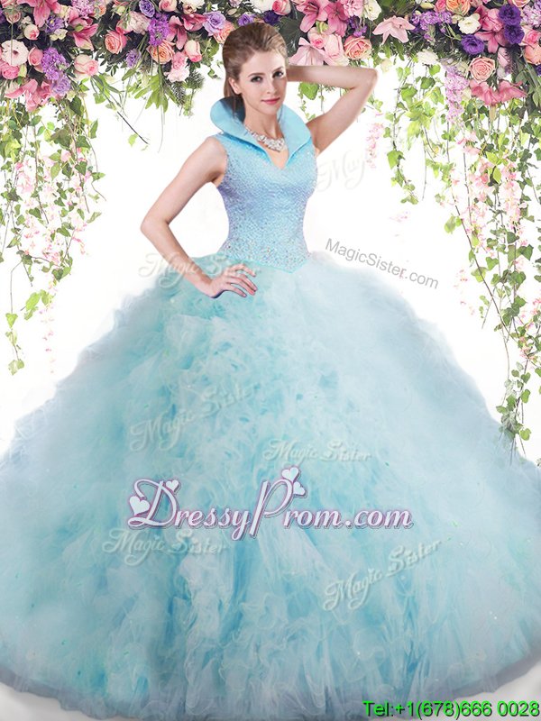 Neckline : High-neckShown Color : Baby BlueSilhouette : Ball GownsSleeve Length : sleevelessHemline : floor lengthBack Detail : BacklessFabric : TulleEmbellishment : Beading,RufflesOccasion : Military Ball,Sweet 16,QuinceaneraSeason : Spring,Summer,Fall,Winter