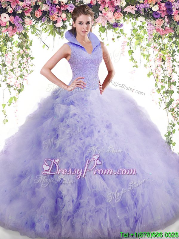 Neckline : High-neckShown Color : LavenderSilhouette : Ball GownsSleeve Length : sleevelessHemline : floor lengthBack Detail : BacklessFabric : TulleEmbellishment : Beading,RufflesOccasion : Military Ball,Sweet 16,QuinceaneraSeason : Spring,Summer,Fall,Winter