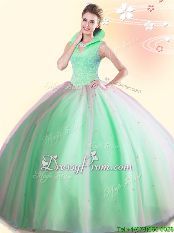 Neckline : High-neckShown Color : Spring GreenSilhouette : Ball GownsSleeve Length : sleevelessHemline : floor lengthBack Detail : BacklessFabric : TulleEmbellishment : BeadingOccasion : Military Ball,Sweet 16,QuinceaneraSeason : Spring,Summer,Fall,Winter