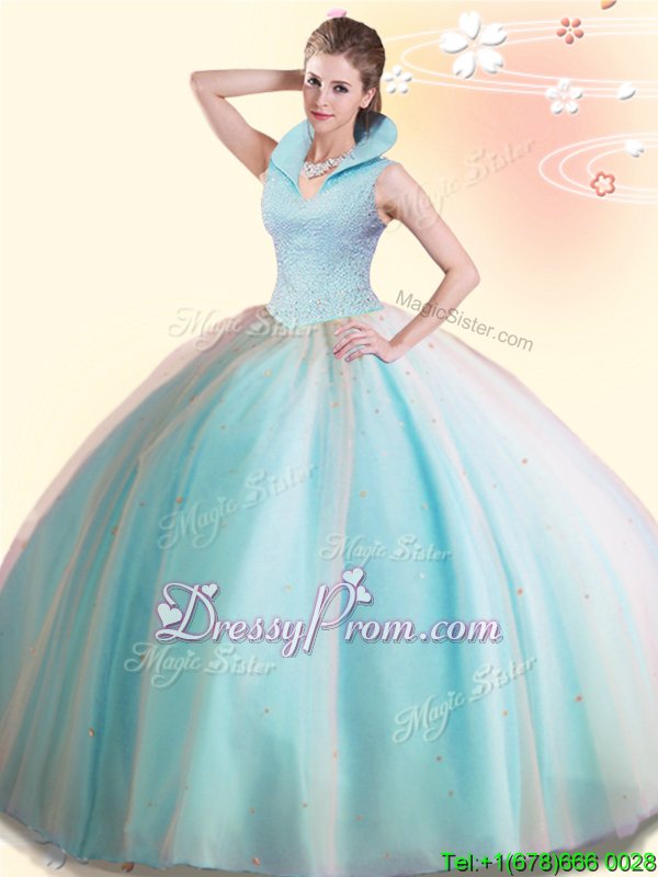 Neckline : High-neckShown Color : Baby BlueSilhouette : Ball GownsSleeve Length : sleevelessHemline : floor lengthBack Detail : BacklessFabric : TulleEmbellishment : BeadingOccasion : Military Ball,Sweet 16,QuinceaneraSeason : Spring,Summer,Fall,Winter