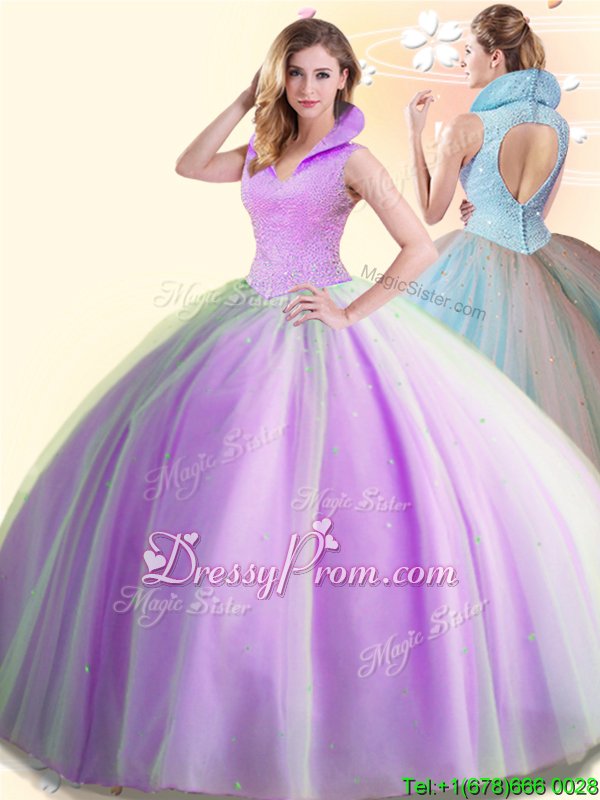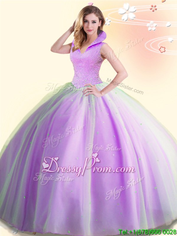 Neckline : High-neckShown Color : LilacSilhouette : Ball GownsSleeve Length : sleevelessHemline : floor lengthBack Detail : BacklessFabric : TulleEmbellishment : BeadingOccasion : Military Ball,Sweet 16,QuinceaneraSeason : Spring,Summer,Fall,Winter