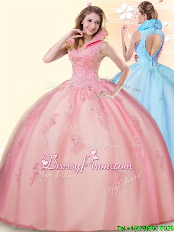 Neckline : High-neckShown Color : Pink Silhouette : Ball GownsSleeve Length : sleevelessHemline : floor lengthBack Detail : BacklessFabric : TulleEmbellishment : Beading,AppliquesOccasion : Military Ball,Sweet 16,QuinceaneraSeason : Spring,Summer,Fall,Winter