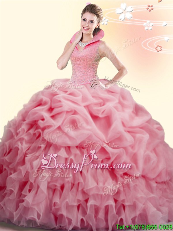 Neckline : High-neckShown Color : Watermelon RedSilhouette : Ball GownsSleeve Length : sleevelessBack Detail : BacklessFabric : OrganzaEmbellishment : Beading,Ruffles,Pick UpsOccasion : Military Ball,Sweet 16,QuinceaneraSeason : Spring,Summer,Fall,Winter