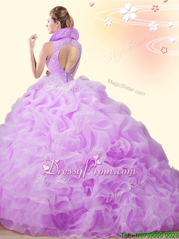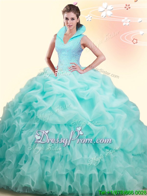 Neckline : High-neckShown Color : Apple GreenSilhouette : Ball GownsSleeve Length : sleevelessBack Detail : BacklessFabric : OrganzaEmbellishment : Beading,Ruffles,Pick UpsOccasion : Military Ball,Sweet 16,QuinceaneraSeason : Spring,Summer,Fall,Winter