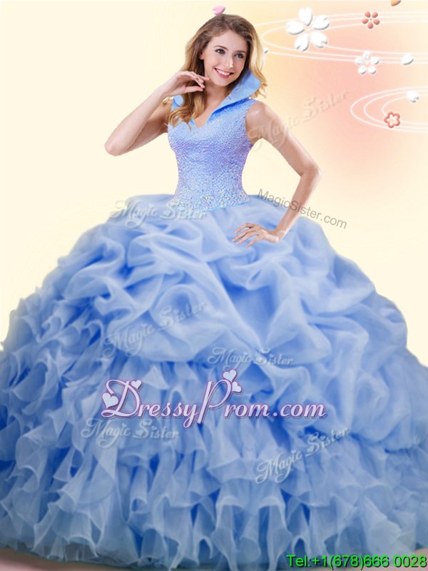 Neckline : High-neckShown Color : BlueSilhouette : Ball GownsSleeve Length : sleevelessBack Detail : BacklessFabric : OrganzaEmbellishment : Beading,Ruffles,Pick UpsOccasion : Military Ball,Sweet 16,QuinceaneraSeason : Spring,Summer,Fall,Winter