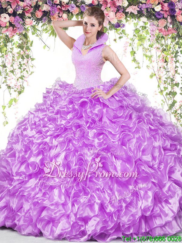 Neckline : High-neckShown Color : LilacSilhouette : Ball GownsSleeve Length : sleevelessHemline : floor lengthBack Detail : BacklessFabric : OrganzaEmbellishment : Beading,RufflesOccasion : Military Ball,Sweet 16,QuinceaneraSeason : Spring,Summer,Fall,Winter