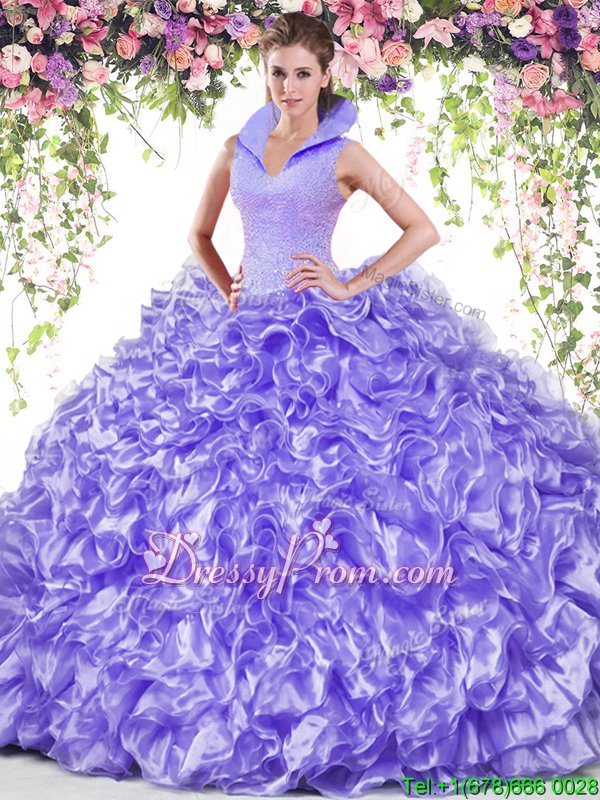 Neckline : High-neckShown Color : LavenderSilhouette : Ball GownsSleeve Length : sleevelessHemline : floor lengthBack Detail : BacklessFabric : OrganzaEmbellishment : Beading,RufflesOccasion : Military Ball,Sweet 16,QuinceaneraSeason : Spring,Summer,Fall,Winter