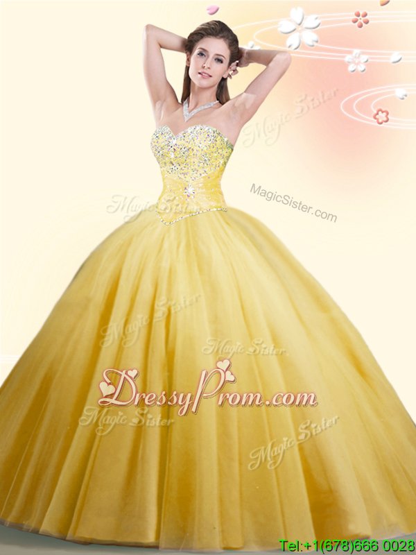 Neckline : SweetheartShown Color : GoldSilhouette : Ball GownsSleeve Length : sleevelessHemline : floor lengthBack Detail : Lace upFabric : TulleEmbellishment : BeadingOccasion : Military Ball,Sweet 16,QuinceaneraSeason : Spring,Summer,Fall,Winter