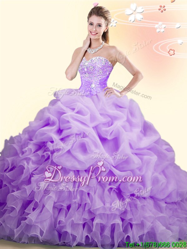 Neckline : SweetheartShown Color : LilacSilhouette : Ball GownsSleeve Length : sleevelessHemline : with trainBack Detail : Lace upFabric : OrganzaEmbellishment : Beading,Ruffles,Pick UpsOccasion : Military Ball,Sweet 16,QuinceaneraSeason : Spring,Summer,Fall,Winter