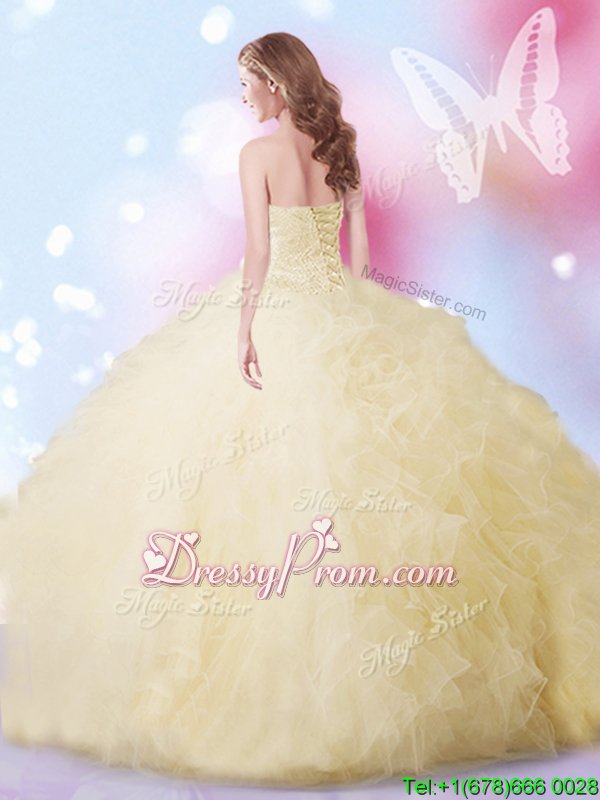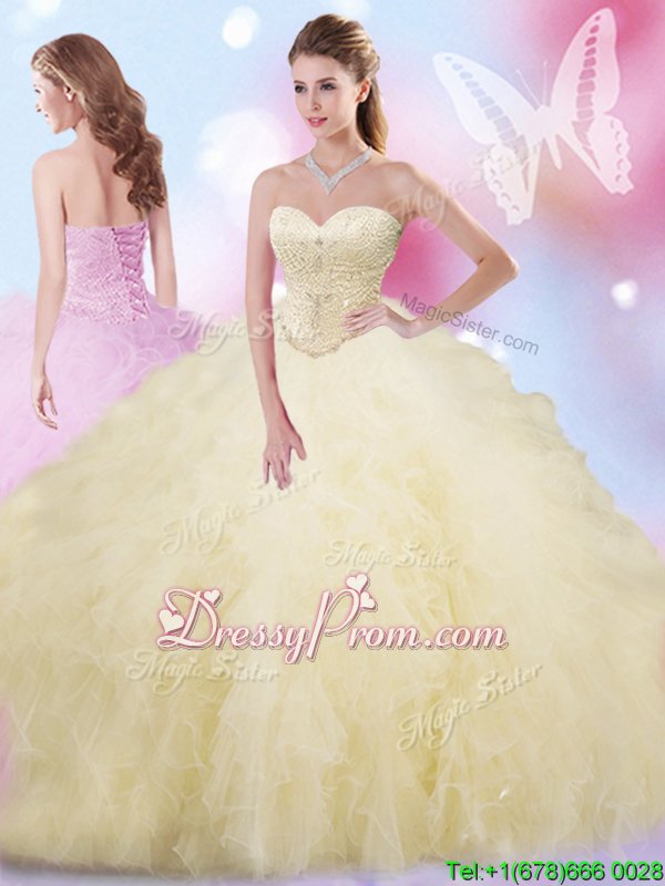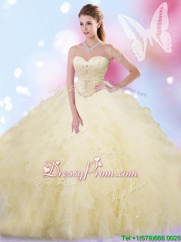Neckline : SweetheartShown Color : ChampagneSilhouette : Ball GownsSleeve Length : sleevelessHemline : floor lengthBack Detail : Lace upFabric : TulleEmbellishment : Beading,RufflesOccasion : Military Ball,Sweet 16,QuinceaneraSeason : Spring,Summer,Fall,Winter