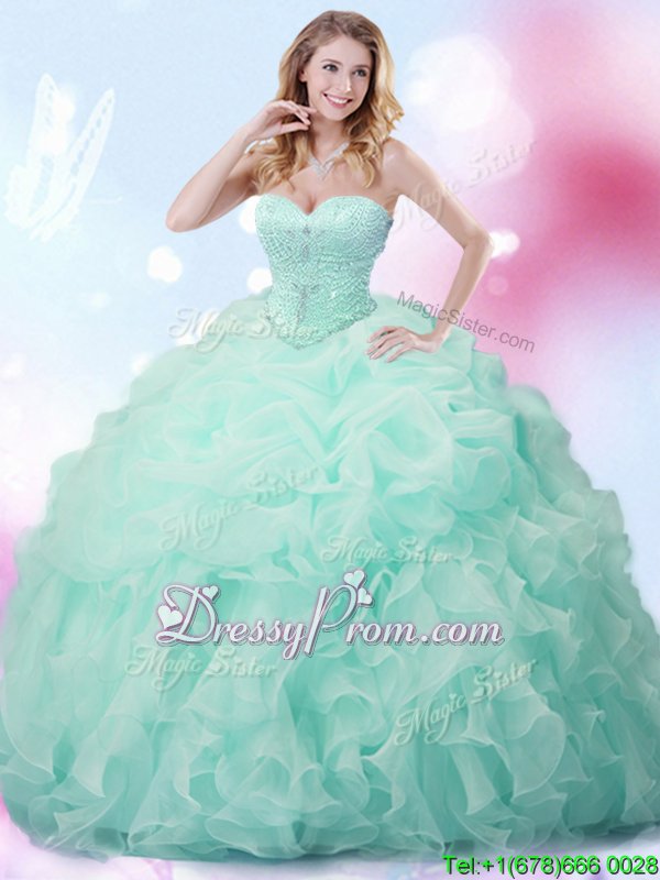 Neckline : Sweetheart Shown Color : Apple Green Silhouette : Ball Gowns Sleeve Length : sleeveless Hemline : with train Back Detail : Lace up Fabric : Organza Embellishment : Beading,Ruffles,Pick Ups Occasion : Military Ball,Sweet 16,Quinceanera Season : Spring,Summer,Fall,Winter