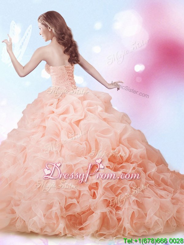 Neckline : SweetheartShown Color : OrangeSilhouette : Ball GownsSleeve Length : sleevelessHemline : with trainBack Detail : Lace upFabric : OrganzaEmbellishment : Beading,Ruffles,Pick UpsOccasion : Military Ball,Sweet 16,QuinceaneraSeason : Spring,Summer,Fall,Winter