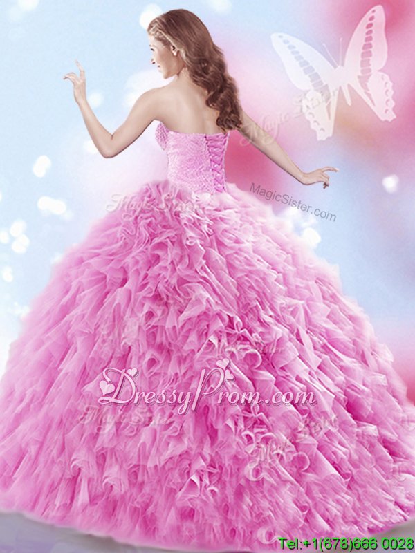Neckline : SweetheartShown Color : Rose Pink Silhouette : Ball GownsSleeve Length : sleevelessHemline : with trainBack Detail : Lace upFabric : TulleEmbellishment : Beading,RufflesOccasion : Military Ball,Sweet 16,QuinceaneraSeason : Spring,Summer,Fall,Winter