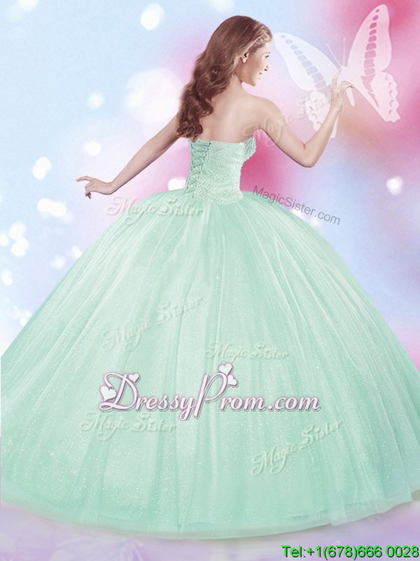 Neckline : SweetheartShown Color : Apple GreenSilhouette : Ball GownsSleeve Length : sleevelessHemline : floor lengthBack Detail : Lace upFabric : TulleEmbellishment : BeadingOccasion : Military Ball,Sweet 16,QuinceaneraSeason : Spring,Summer,Fall,Winter