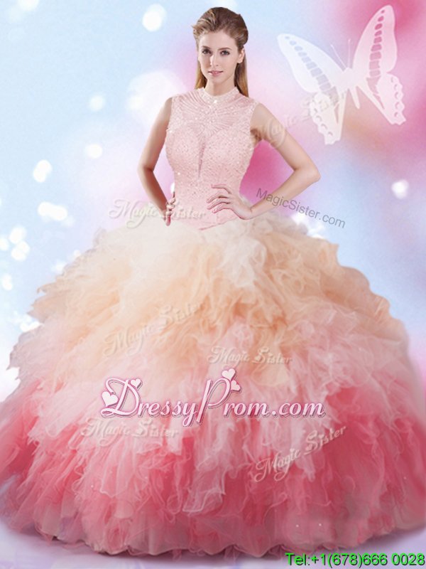 Neckline : High-neckShown Color : Multi-colorSilhouette : Ball GownsSleeve Length : sleevelessHemline : floor lengthBack Detail : Lace upFabric : TulleEmbellishment : Beading,RufflesOccasion : Military Ball,Sweet 16,QuinceaneraSeason : Spring,Summer,Fall,Winter
