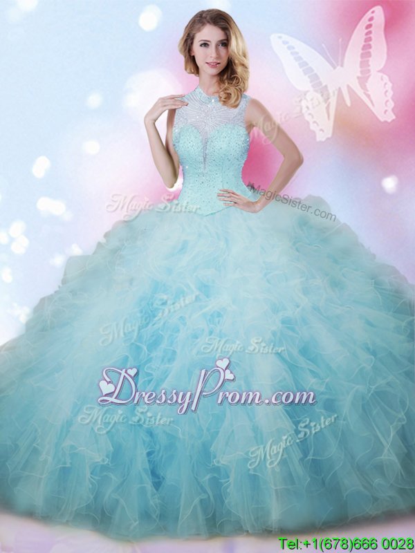 Neckline : High-neckShown Color : Baby BlueSilhouette : Ball GownsSleeve Length : sleevelessHemline : floor lengthBack Detail : Lace upFabric : TulleEmbellishment : Beading,RufflesOccasion : Military Ball,Sweet 16,QuinceaneraSeason : Spring,Summer,Fall,Winter