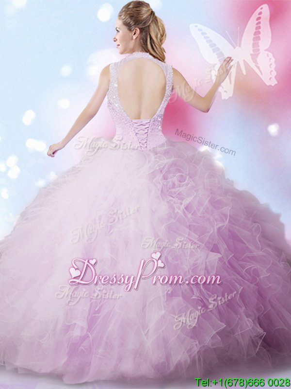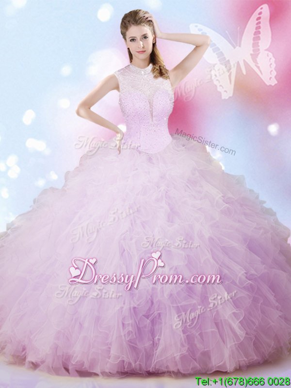 Neckline : High-neckShown Color : LavenderSilhouette : Ball GownsSleeve Length : sleevelessHemline : floor lengthBack Detail : Lace upFabric : TulleEmbellishment : Beading,RufflesOccasion : Military Ball,Sweet 16,QuinceaneraSeason : Spring,Summer,Fall,Winter