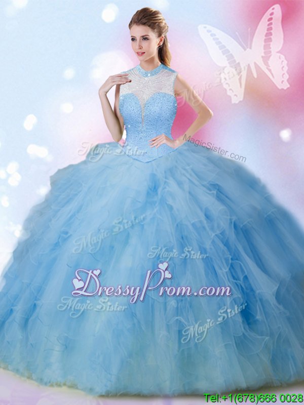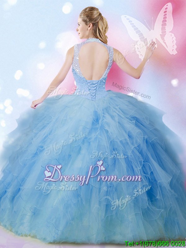 Modern Baby Blue Lace Up High-neck Beading and Ruffles 15th Birthday Dress Tulle Sleeveless
