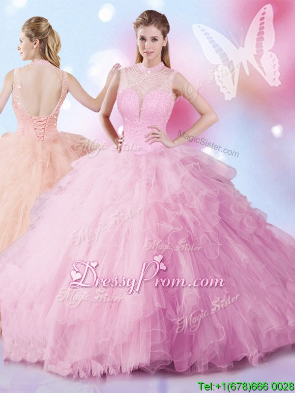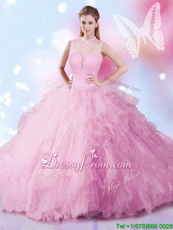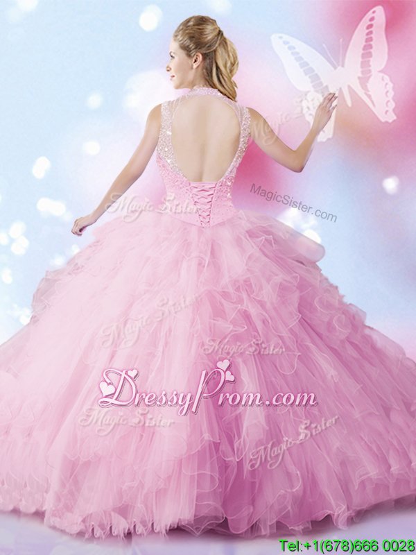 Designer Rose Pink Lace Up Beading and Ruffles 15 Quinceanera Dress Sleeveless