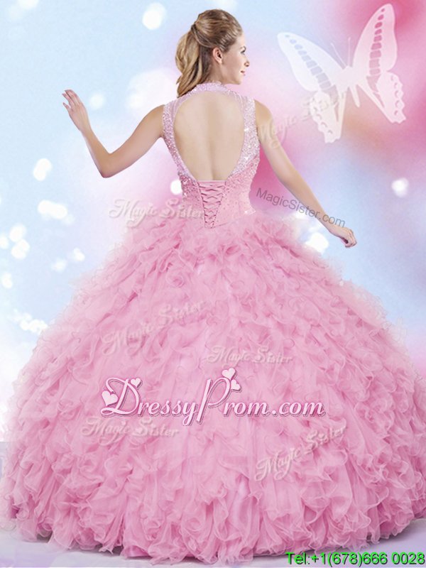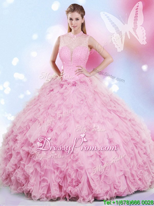 Shown Color : Rose Pink Silhouette : Ball GownsSleeve Length : sleevelessHemline : floor lengthBack Detail : Lace upFabric : TulleEmbellishment : Beading,RufflesOccasion : Military Ball,Sweet 16,QuinceaneraSeason : Spring,Summer,Fall,Winter