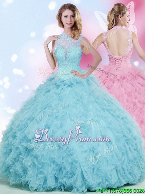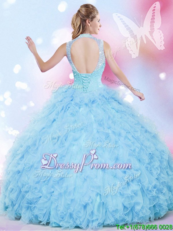 Neckline : High-neckShown Color : Baby BlueSilhouette : Ball GownsSleeve Length : sleevelessHemline : floor lengthBack Detail : Lace upFabric : TulleEmbellishment : Beading,RufflesOccasion : Military Ball,Sweet 16,QuinceaneraSeason : Spring,Summer,Fall,Winter