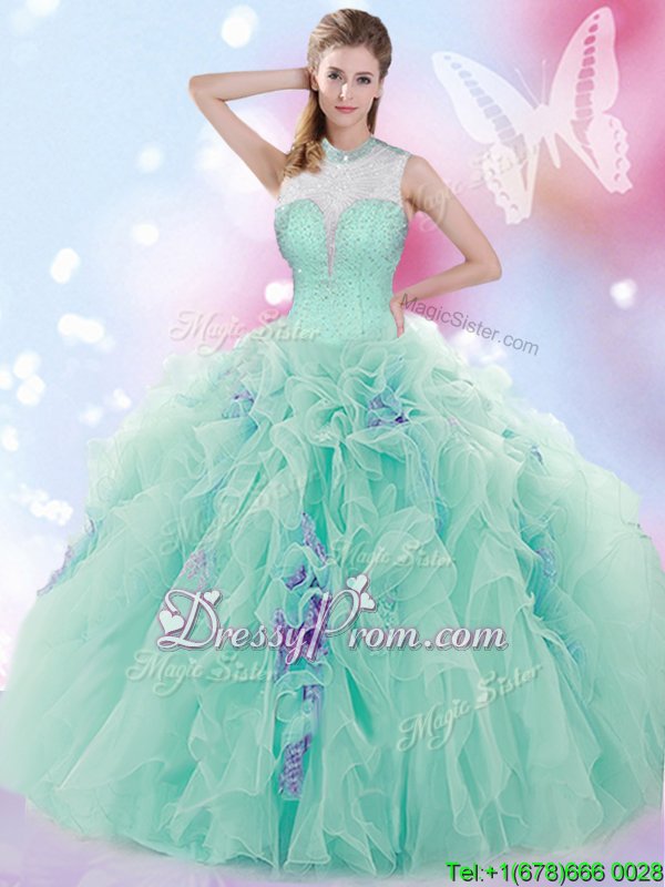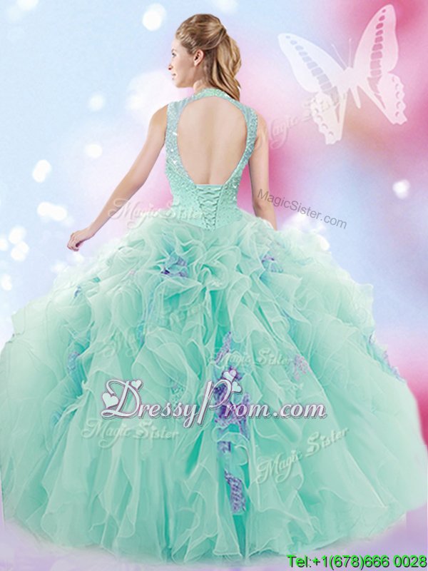 Suitable Sleeveless Tulle Floor Length Lace Up 15 Quinceanera Dress inApple Green forSpring and Summer and Fall and Winter withBeading and Ruffles