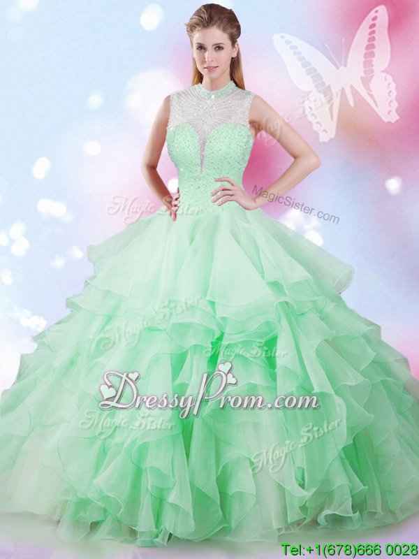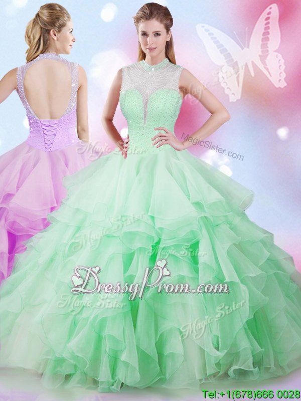 Cute Floor Length Apple Green Sweet 16 Dresses High-neck Sleeveless Lace Up