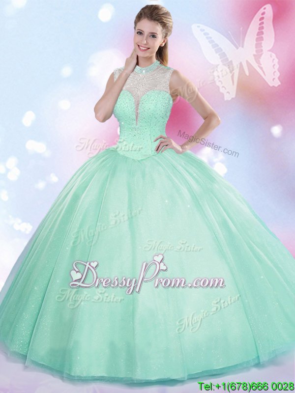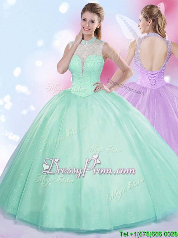 Discount Apple Green Lace Up High-neck Beading Quinceanera Gowns Tulle Sleeveless