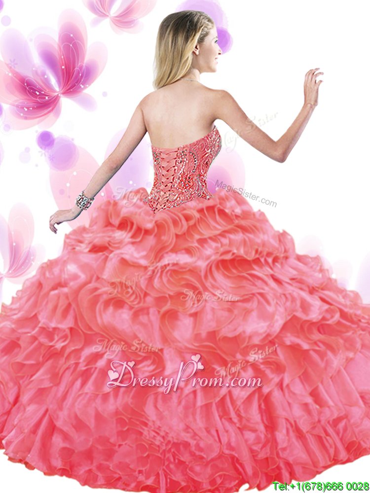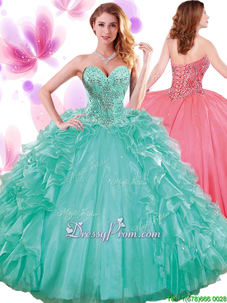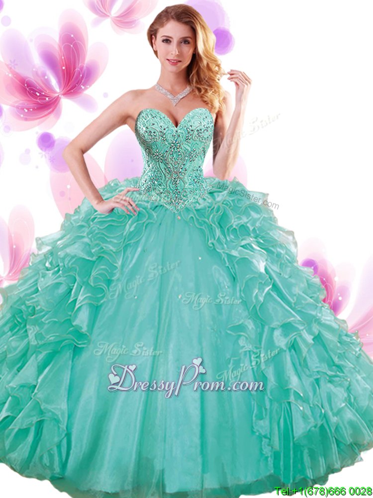 Neckline : SweetheartShown Color : TurquoiseSilhouette : Ball GownsSleeve Length : sleevelessHemline : floor lengthBack Detail : Lace upFabric : OrganzaEmbellishment : Beading,Ruffles,Pick UpsOccasion : Military Ball,Sweet 16,QuinceaneraSeason : Spring,Summer,Fall,Winter