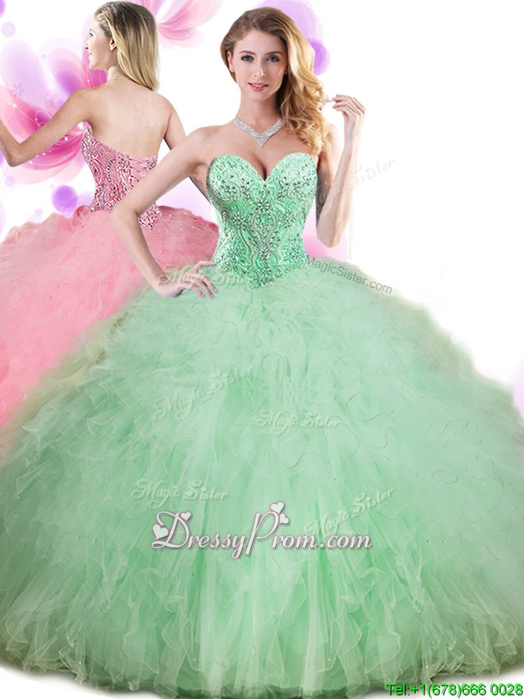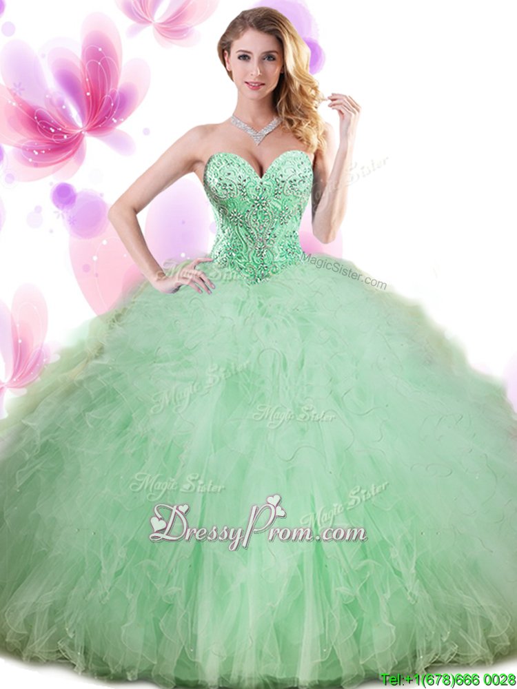 Neckline : SweetheartShown Color : Apple GreenSilhouette : Ball GownsSleeve Length : sleevelessHemline : floor lengthBack Detail : Lace upFabric : TulleEmbellishment : Beading,Ruffles,Pick UpsOccasion : Military Ball,Sweet 16,QuinceaneraSeason : Spring,Summer,Fall,Winter