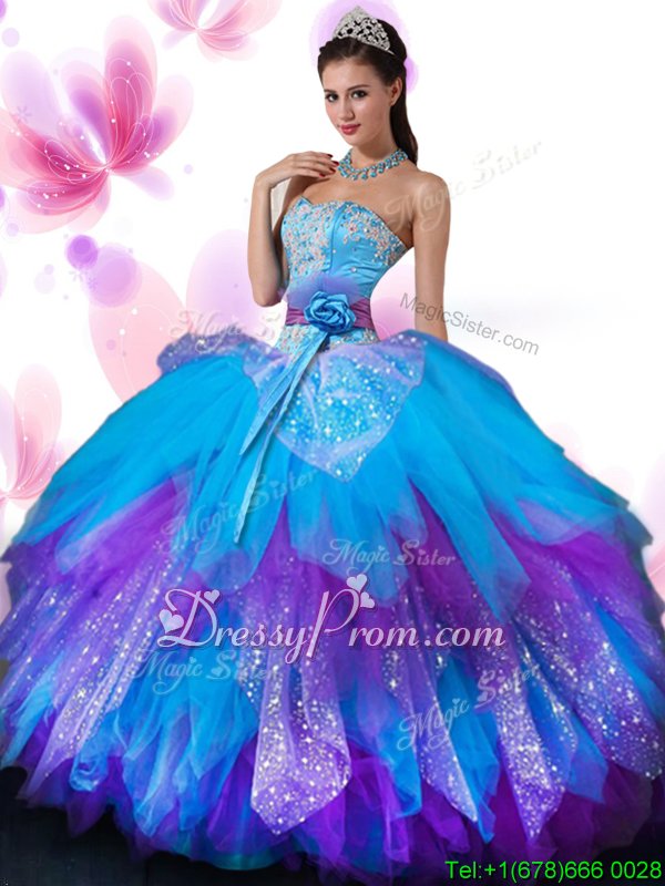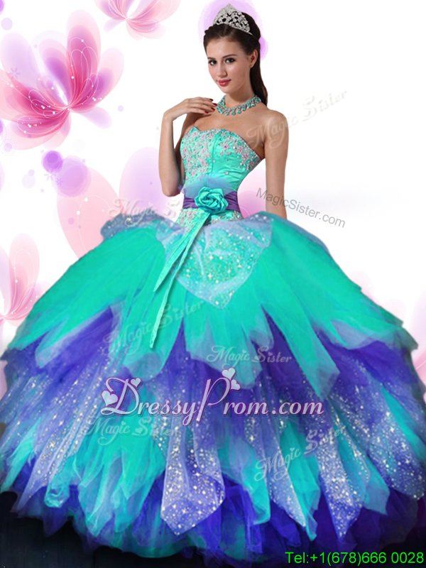 Neckline : SweetheartShown Color : Multi-colorSilhouette : Ball GownsSleeve Length : sleevelessHemline : floor lengthBack Detail : Lace upFabric : TulleEmbellishment : Appliques,Ruffled Layers,Hand Made FlowerOccasion : Military Ball,Sweet 16,QuinceaneraSeason : Spring,Summer,Fall,Winter
