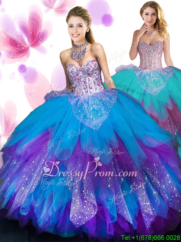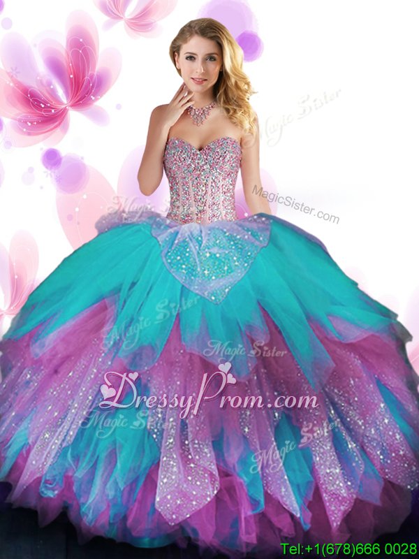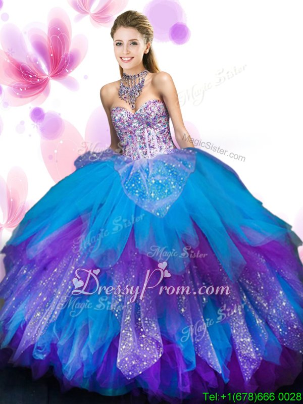 Custom Design Spring and Summer and Fall and Winter Tulle Sleeveless Floor Length Ball Gown Prom Dress andBeading and Ruffled Layers