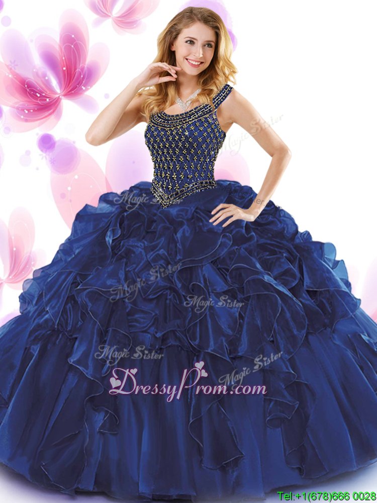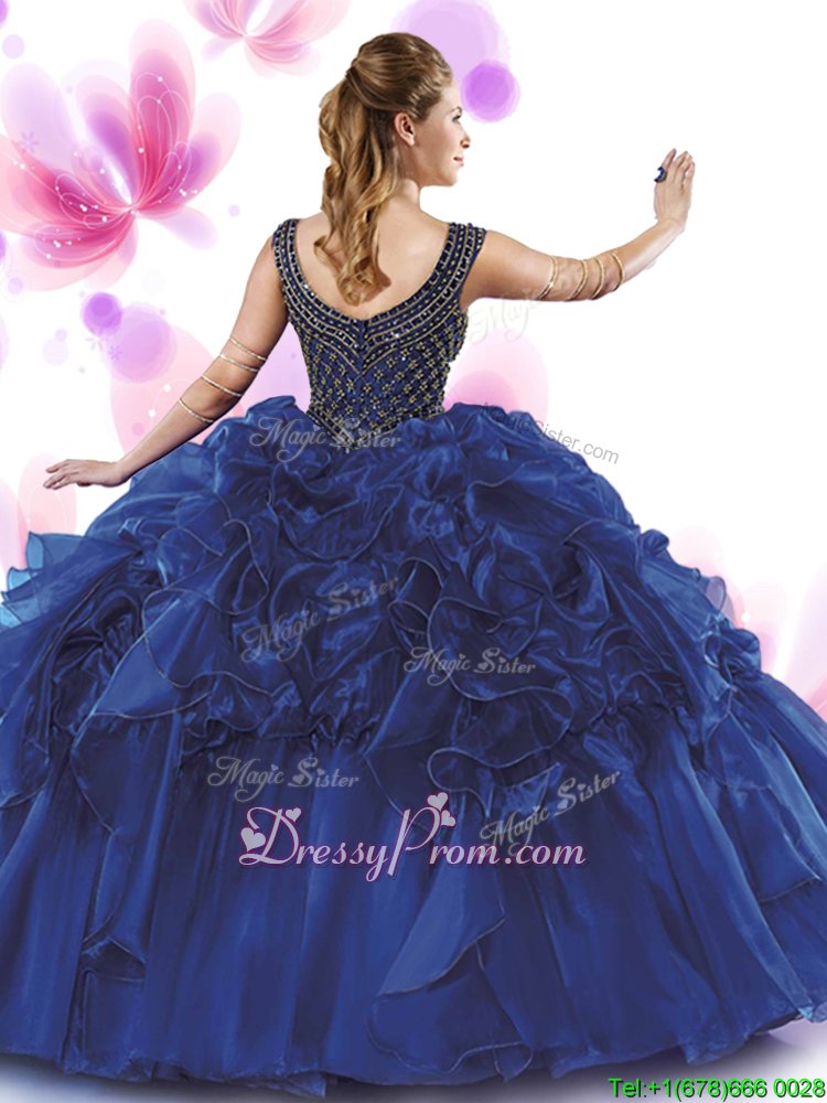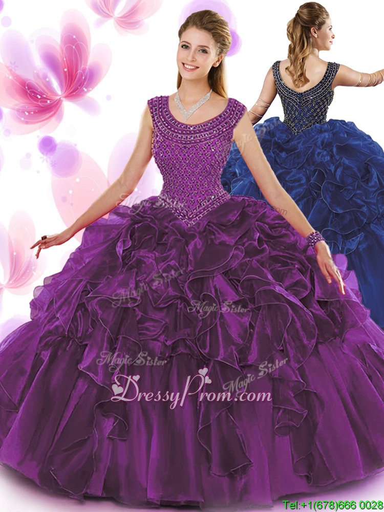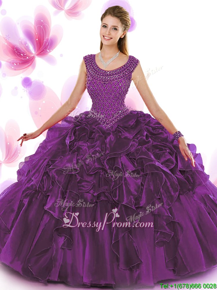 Neckline : ScoopShown Color : Dark PurpleSilhouette : Ball GownsSleeve Length : sleevelessHemline : floor lengthBack Detail : ZipperFabric : OrganzaEmbellishment : Beading,RufflesOccasion : Military Ball,Sweet 16,QuinceaneraSeason : Spring,Summer,Fall,Winter