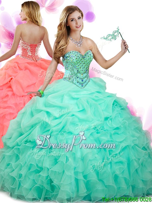 Neckline : SweetheartShown Color : Apple GreenSilhouette : Ball GownsSleeve Length : sleevelessHemline : floor lengthBack Detail : Lace upFabric : OrganzaEmbellishment : Beading,Ruffles,Pick UpsOccasion : Military Ball,Sweet 16,QuinceaneraSeason : Spring,Summer,Fall,Winter