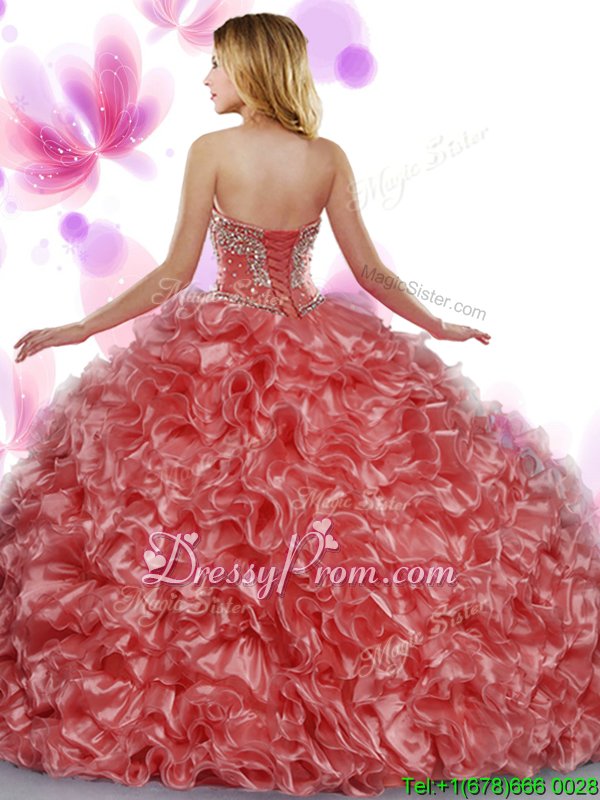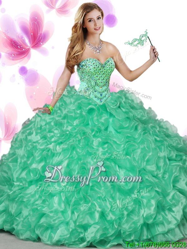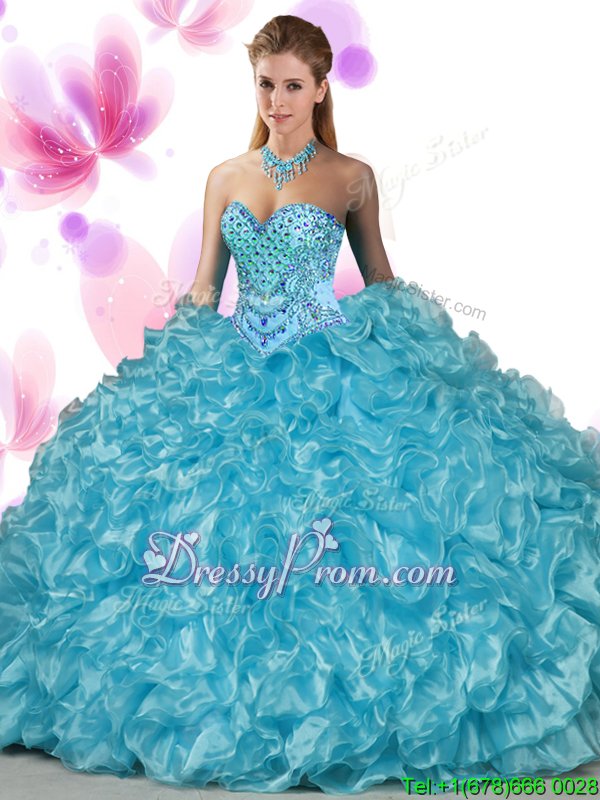 Neckline : SweetheartShown Color : TurquoiseSilhouette : Column/SheathSleeve Length : sleevelessHemline : floor lengthBack Detail : Lace upFabric : OrganzaEmbellishment : Beading,RufflesOccasion : Military Ball,Sweet 16,QuinceaneraSeason : Spring,Summer,Fall,Winter