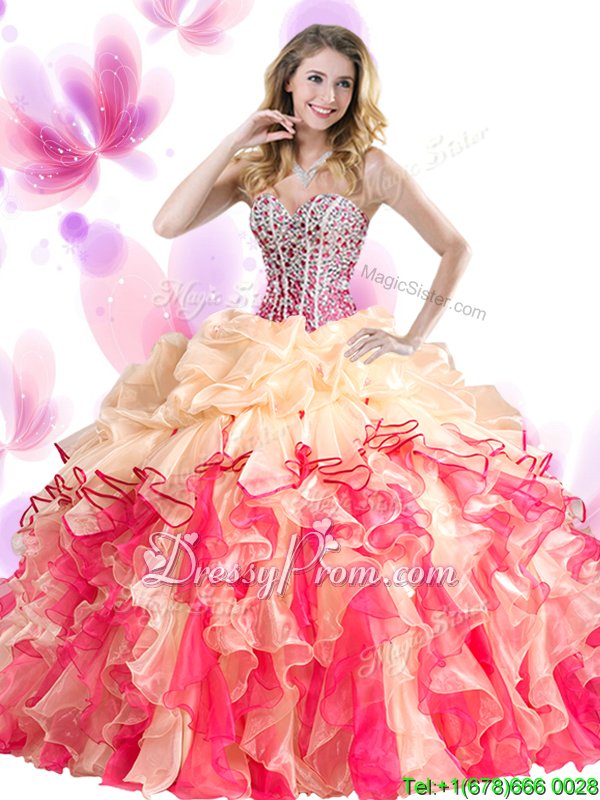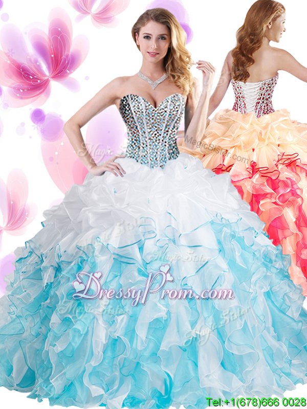 Neckline : SweetheartShown Color : White,Blue,Blue And WhiteSilhouette : Ball GownsSleeve Length : sleevelessHemline : floor lengthBack Detail : Lace upFabric : OrganzaEmbellishment : Beading,RufflesOccasion : Military Ball,Sweet 16,QuinceaneraSeason : Spring,Summer,Fall,Winter