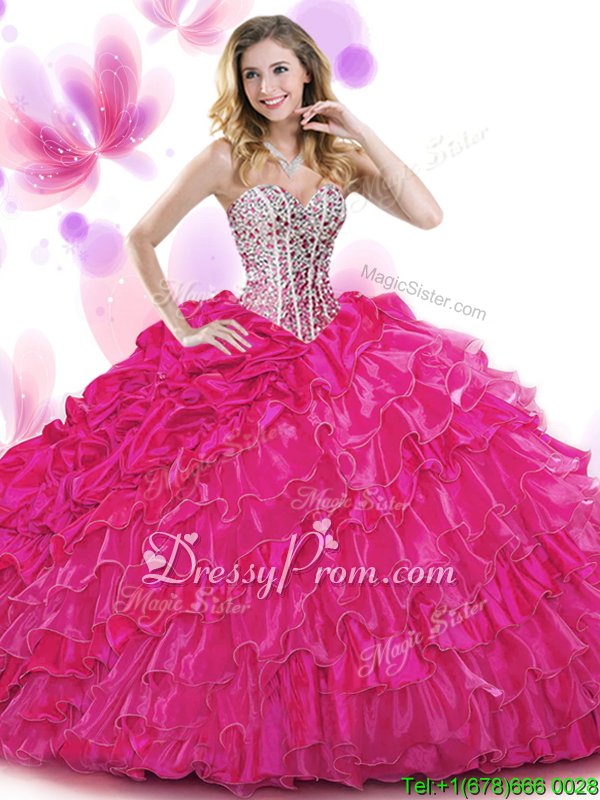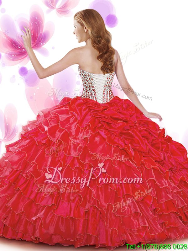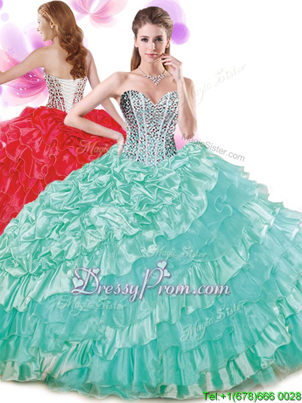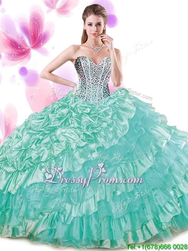 Neckline : SweetheartShown Color : TurquoiseSilhouette : Ball GownsSleeve Length : sleevelessHemline : floor lengthBack Detail : Lace upFabric : Organza,TaffetaEmbellishment : Beading,Ruffled Layers,Pick UpsOccasion : Military Ball,Sweet 16,QuinceaneraSeason : Spring,Summer,Fall,Winter