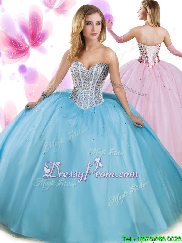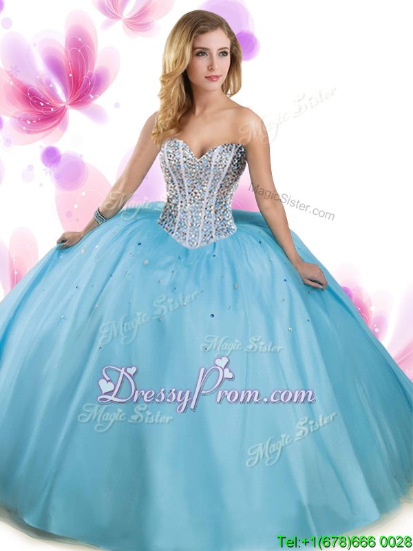 Neckline : SweetheartShown Color : Aqua BlueSilhouette : Ball GownsSleeve Length : sleevelessHemline : floor lengthBack Detail : Lace upFabric : TulleEmbellishment : BeadingOccasion : Military Ball,Sweet 16,QuinceaneraSeason : Spring,Summer,Fall,Winter