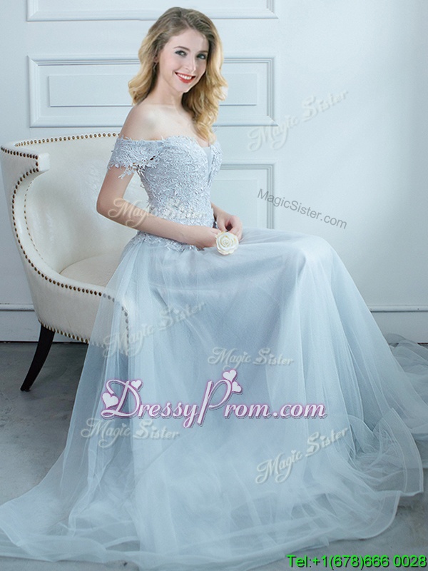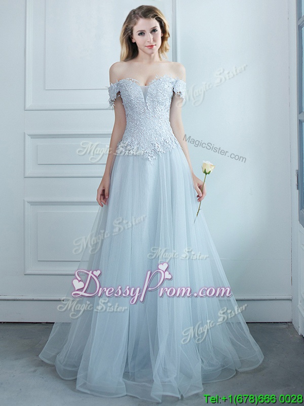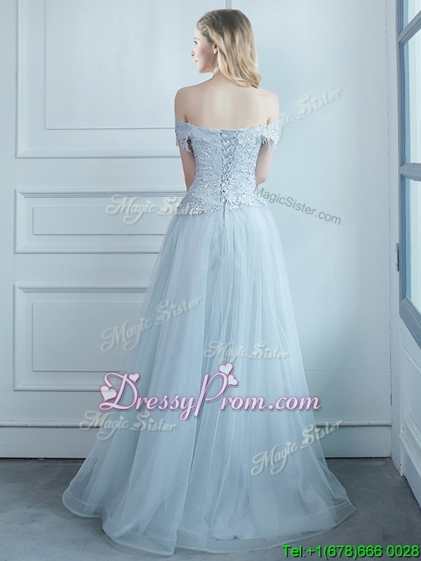 Neckline : Off the shoulder Shown Color : Light Blue Silhouette : Empire Sleeve Length : cap sleeves Hemline : floor length Back Detail : Lace up Fabric : Tulle Embellishment : Beading,Appliques Occasion : Prom,Party Season : Spring,Summer,Fall,Winter