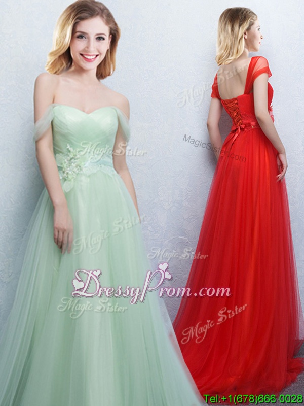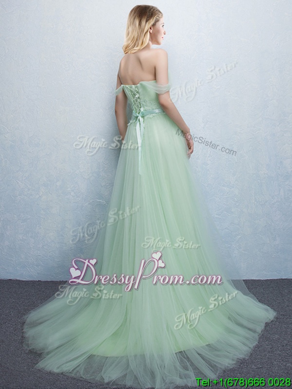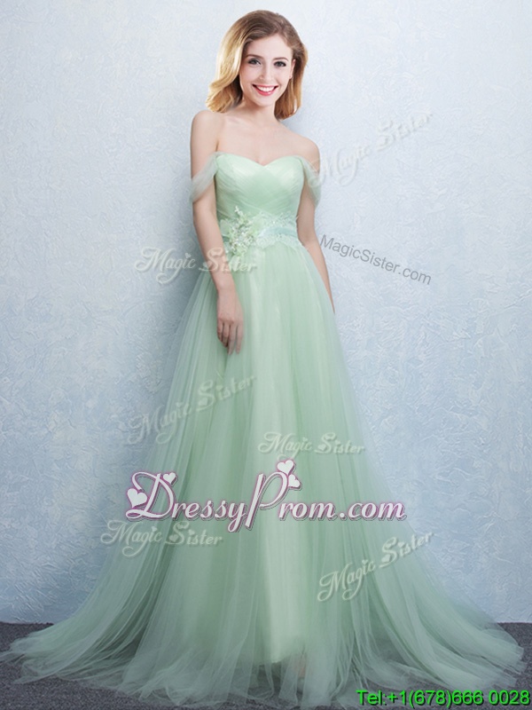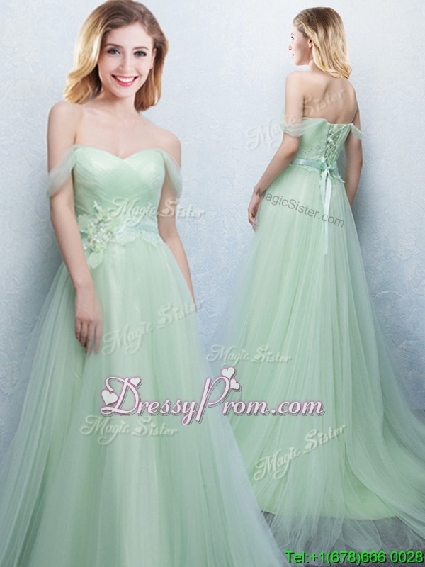 Neckline : Off the shoulder Shown Color : Apple Green Silhouette : Empire Sleeve Length : sleeveless Hemline : with train Back Detail : Lace up Fabric : Tulle Embellishment : Appliques,Ruching Occasion : Prom,Party,Wedding Party Season : Spring,Summer,Fall,Winter