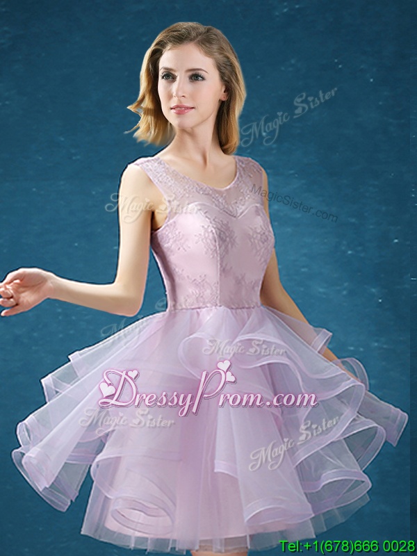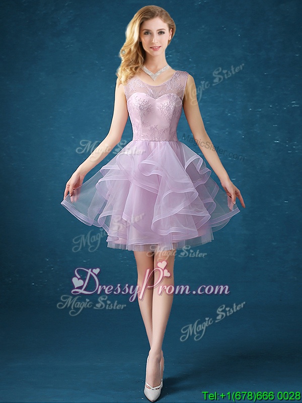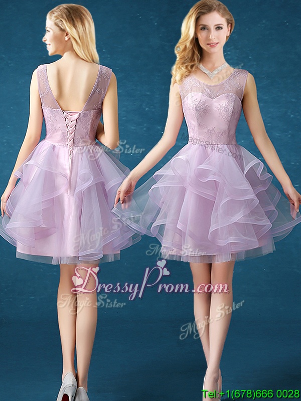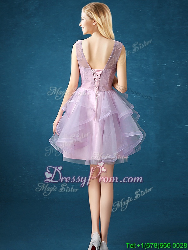 Neckline : ScoopShown Color : LavenderSilhouette : A-lineSleeve Length : sleevelessHemline : knee lengthBack Detail : Lace upFabric : Organza,TulleEmbellishment : LaceOccasion : PromSeason : Spring,Summer