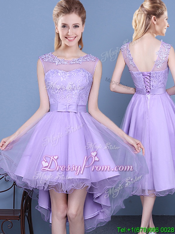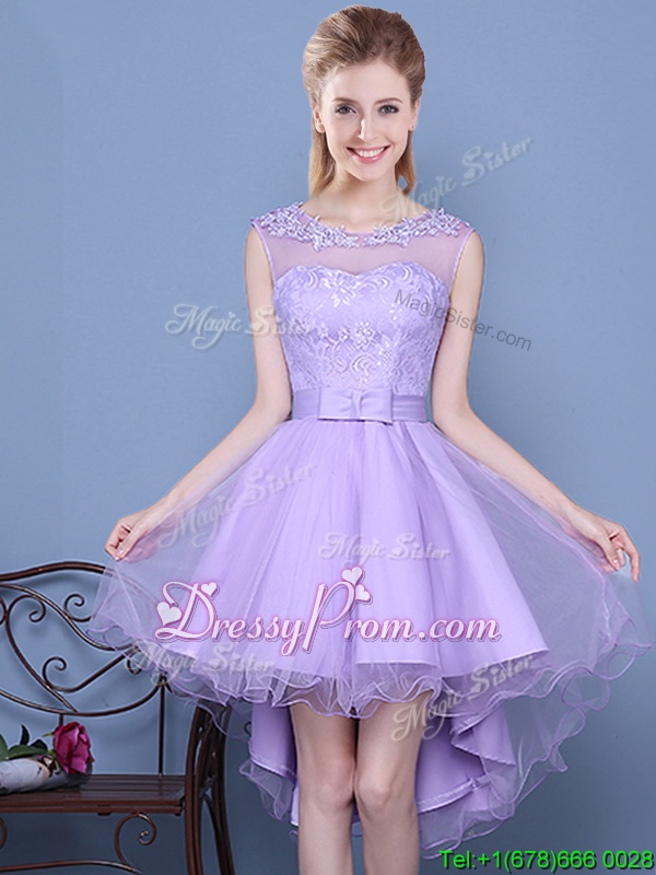 Neckline : ScoopShown Color : LavenderSilhouette : A-lineSleeve Length : sleevelessHemline : mini lengthBack Detail : Lace upFabric : OrganzaEmbellishment : LaceOccasion : PromSeason : Spring,Summer