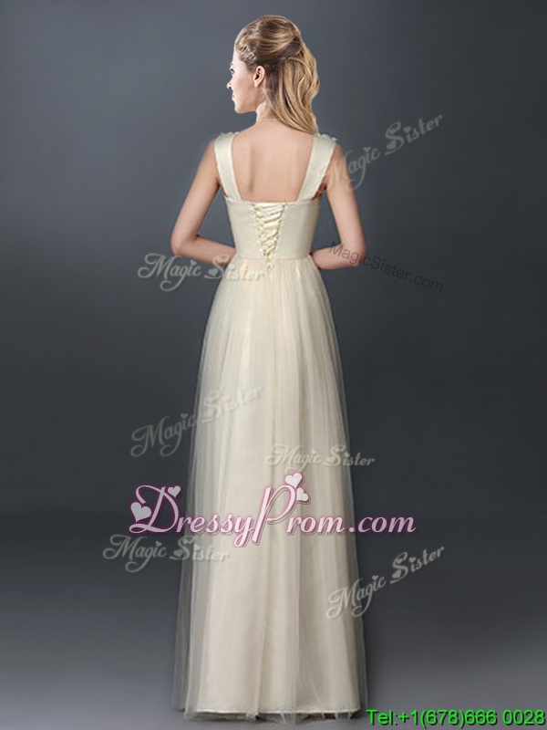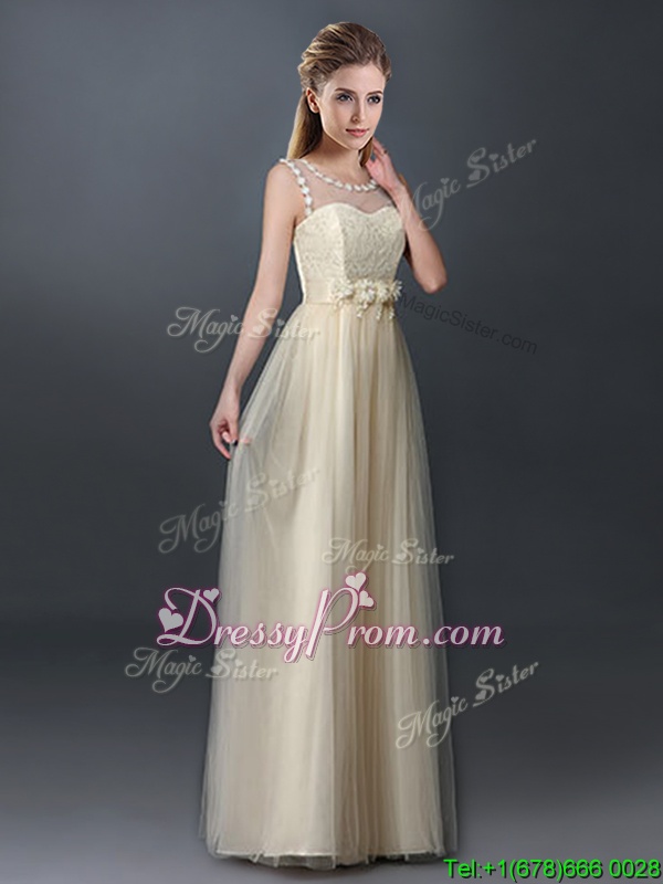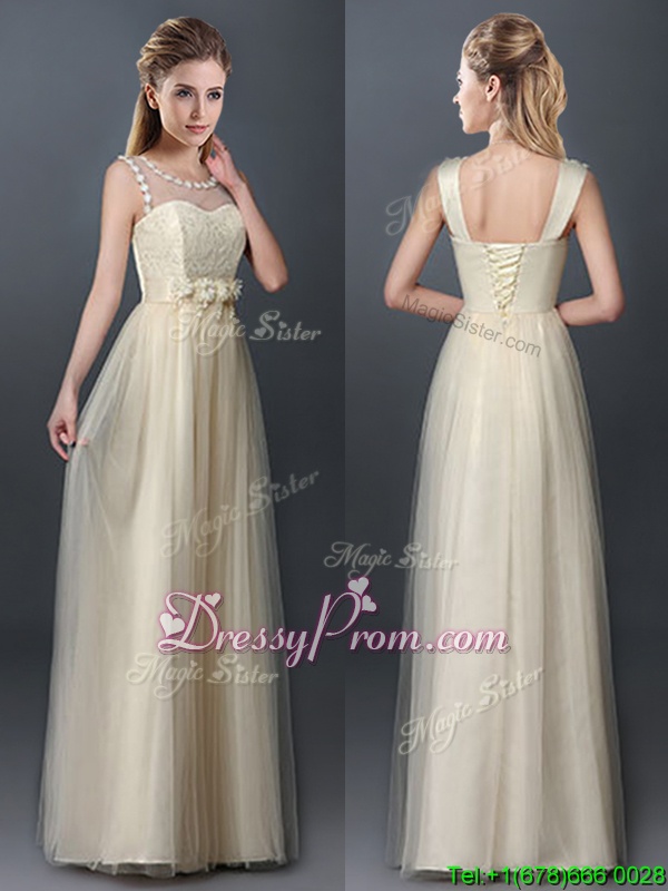 Neckline : ScoopShown Color : ChampagneSilhouette : EmpireSleeve Length : sleevelessHemline : floor lengthBack Detail : Lace upFabric : TulleEmbellishment : Lace,Hand Made FlowerOccasion : Prom,Party,Wedding PartySeason : Spring,Summer,Fall,Winter