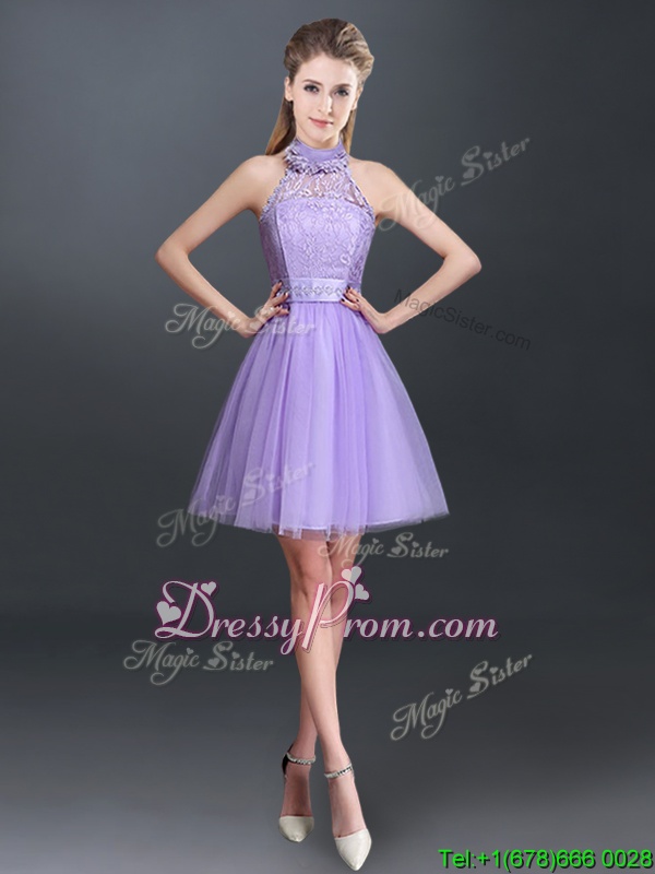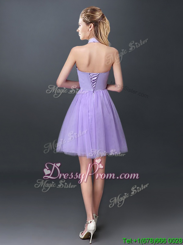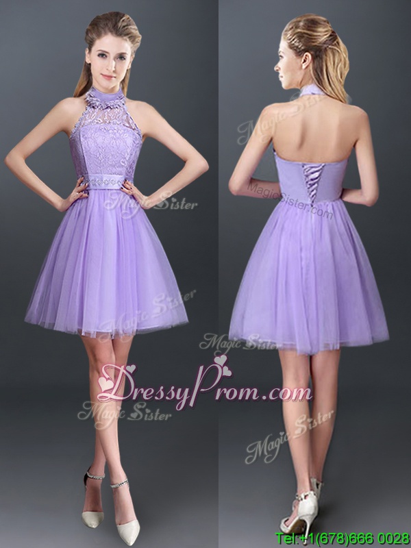 Neckline : Halter topShown Color : LavenderSilhouette : A-lineSleeve Length : sleevelessHemline : mini lengthBack Detail : Lace upFabric : TulleEmbellishment : Lace,AppliquesOccasion : Prom,Party,Wedding PartySeason : Spring,Summer,Fall
