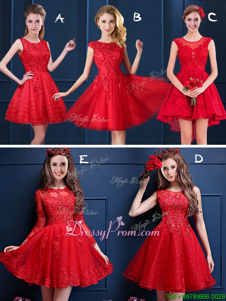 Neckline : ScoopShown Color : RedSilhouette : A-lineSleeve Length : sleevelessHemline : mini lengthBack Detail : Lace upFabric : Tulle,LaceEmbellishment : Lace,AppliquesOccasion : Prom,Party,Wedding PartySeason : Spring,Summer,Fall
