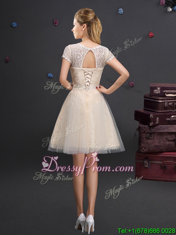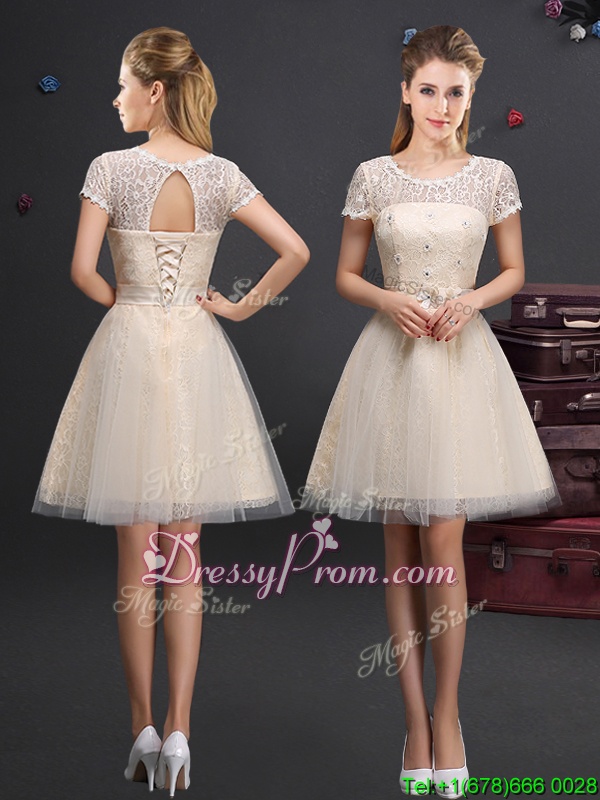 Neckline : ScoopShown Color : ChampagneSilhouette : A-lineSleeve Length : sleevelessHemline : mini lengthBack Detail : Lace upFabric : TulleEmbellishment : AppliquesOccasion : Prom,Party,Wedding PartySeason : Spring,Summer,Fall